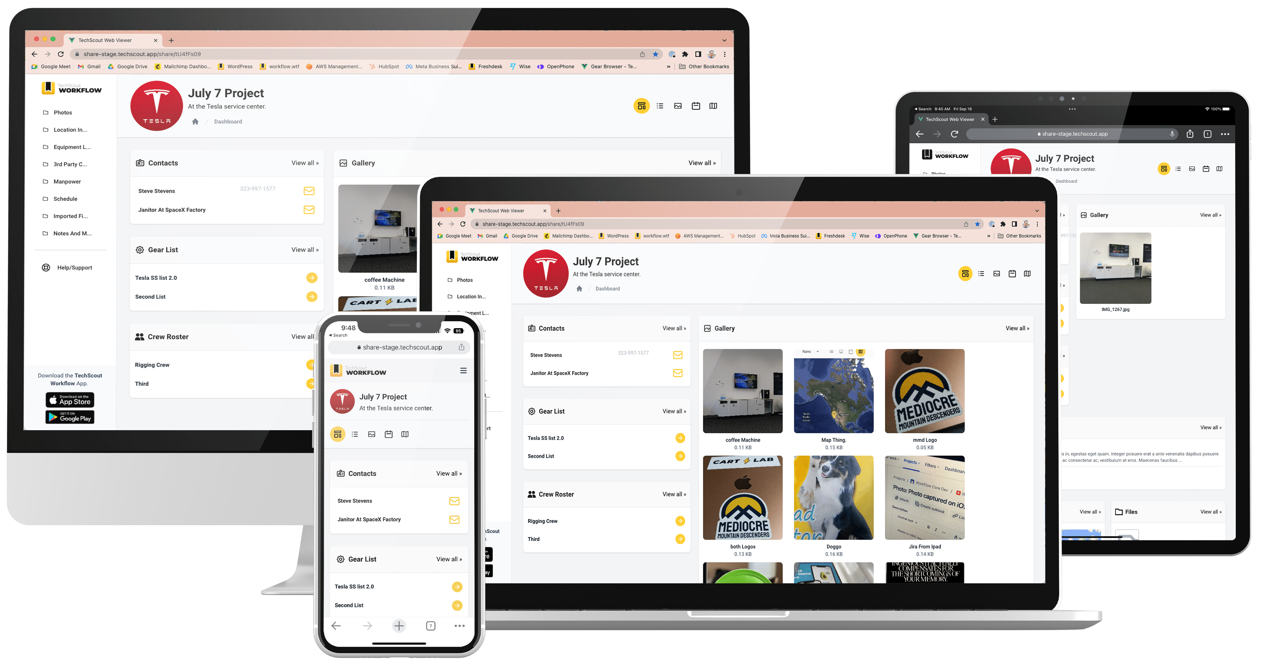 As you create lists, capture photos, and build your project, WorkFlow is busy in the cloud creating the ultimate sharing web space. WorkFlow sharing will revolutionize how you communicate with your crew by creating a secure website for each Project. Finally, you can easily share all aspects (or just some) of your info with your entire team, production, and other departments. In the app, just set a password, and send the link. It’s that simple. Your project will never be out of date, because it updates as you go. Here is what you can share: