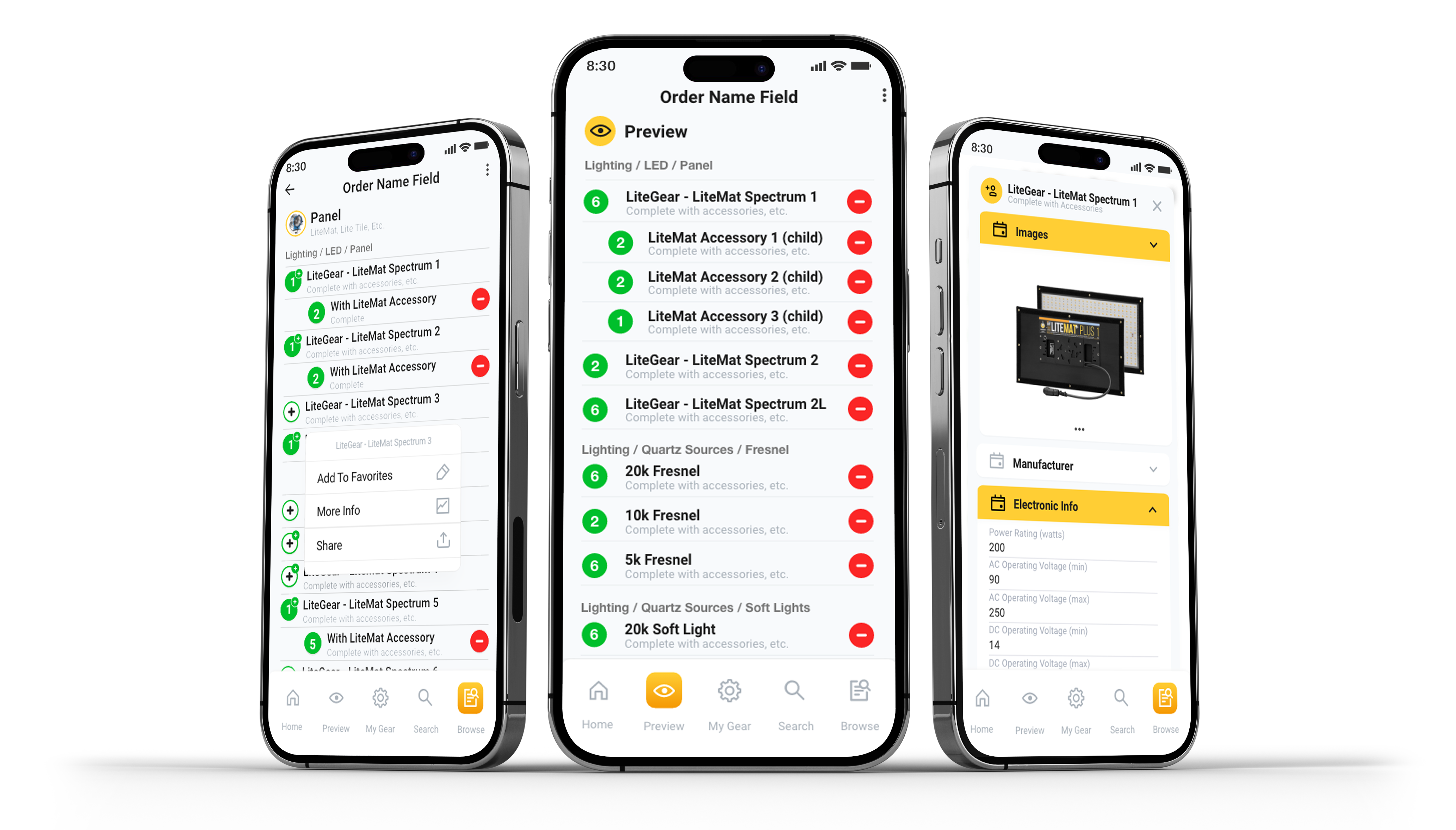 WorkFlow Gear Lists will revolutionize the way you create, organize, and share equipment lists. Easily add items from our robust and beautifully categorized equipment lists. Our database has been in development since the very first version of TechScout Touch back in 2011 and is curated by working gaffers, key grips, best boys, and camera assistants world-wide. And, there are lots of ways to make WorkFlow GearLists your own. First, you can create “SetUps” like Overhead Softbox, or Condor Rig that includes a subset of gear you can reuse on future orders with just one click. Next, easily bookmark your favorite gear for quick access when in a hurry. You can even add your own items like Pizza Box Light or Covered Wagons. Once done, copy the link and send it off to the rental house. That’s it.